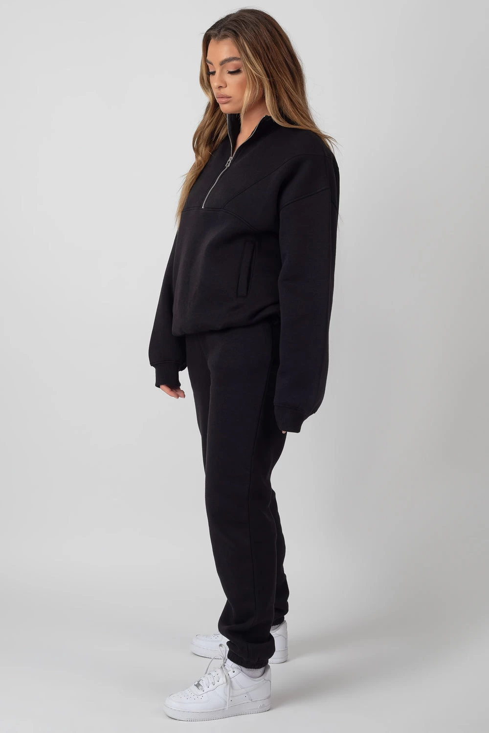 A jogger with an oversized fit featuring elasticated waists and cuffs and pockets in black.