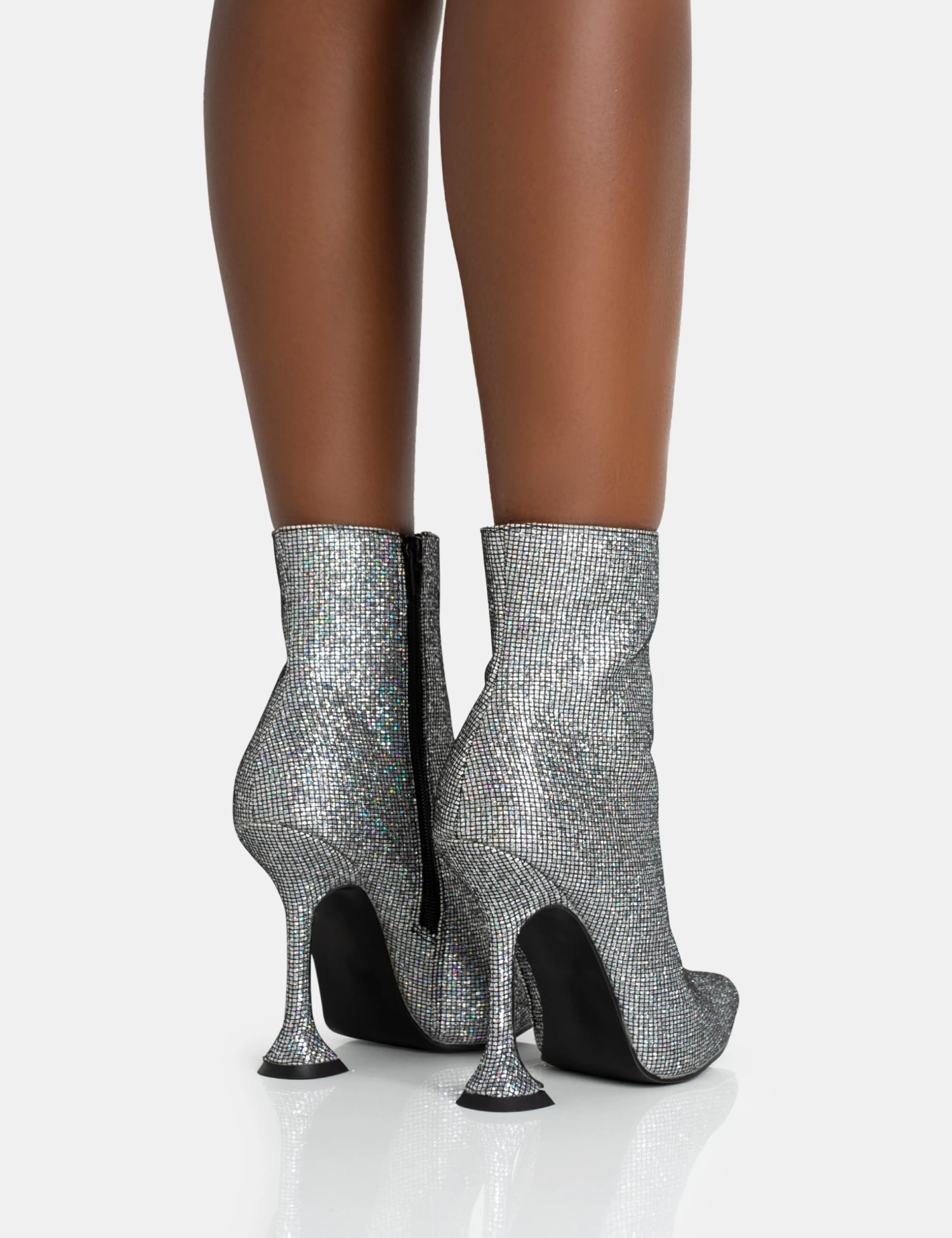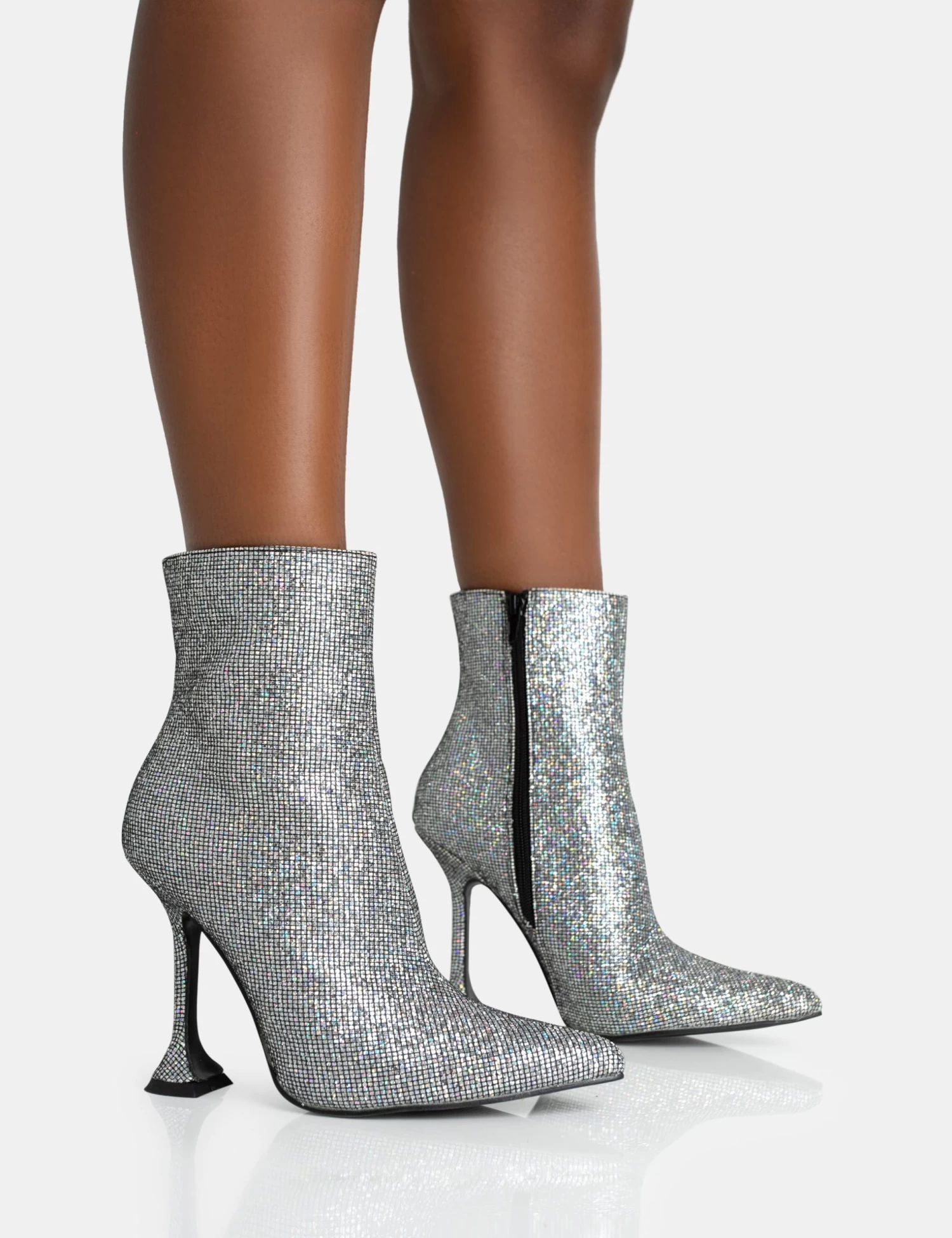 Elevate your look with a pop of sparkle – featuring Arabella in silver glitter, with a pointed toe, cake stand heel and an ankle boot design.