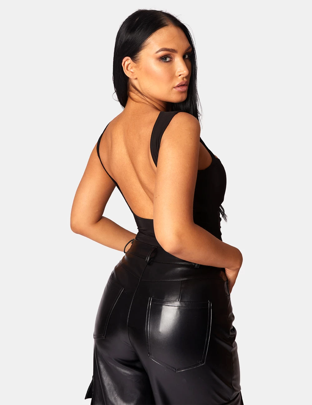 ASYMMETRIC WAISTBAND PU CARGO TROUSERS BLACK