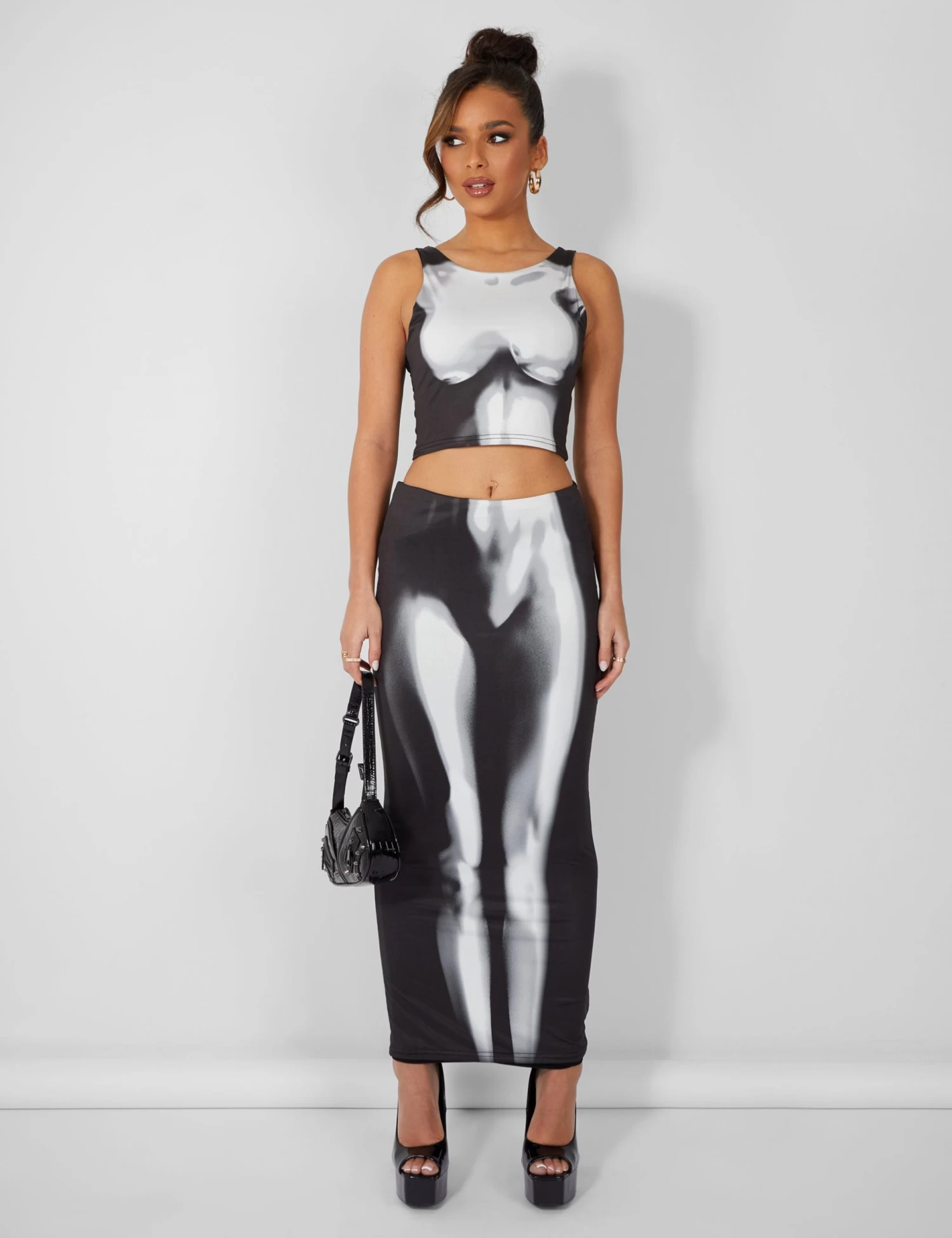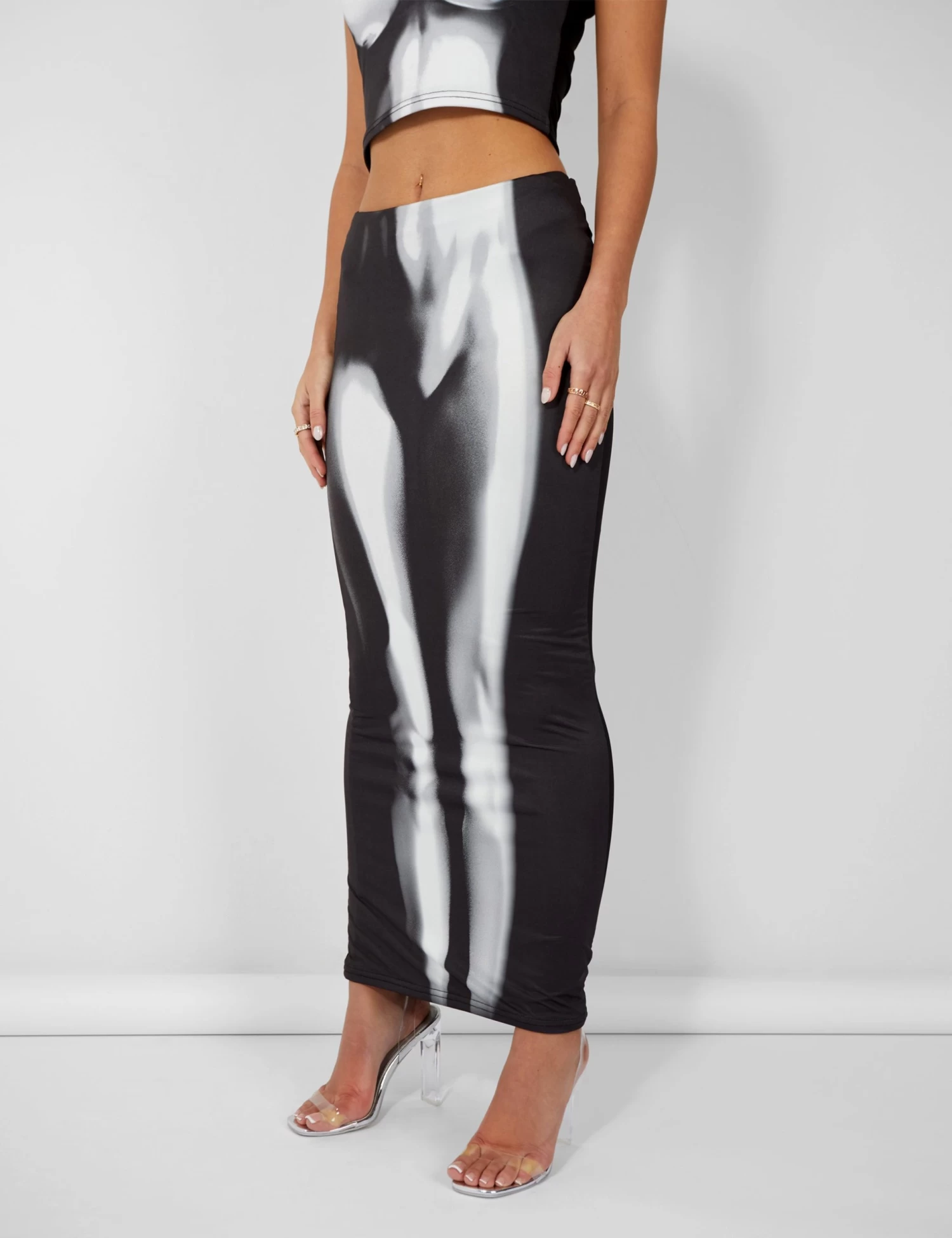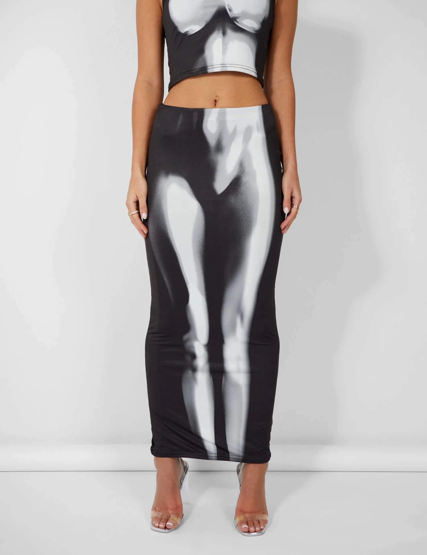Introducing the new era of Public Desire! Step into our fantasy in bold metallics, sci fi sexy cut out pieces and vibrant prints. This midaxi skirt is the ultimate sexy style. It features a body heat print and flirty silhouette that will hug your curves and show off your figure. The black hue is timeless whilst the print add a touch of modernity. Whether you’re off on a date, meeting your besties, this skirt will give you a sexy vibe that will sure turn heads.Â