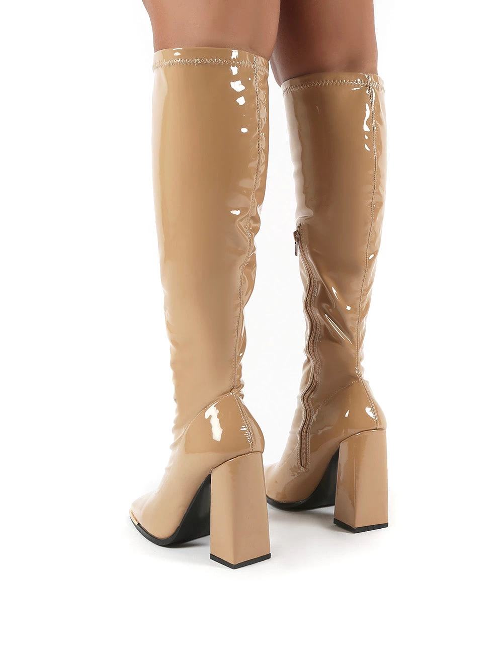 Caryn is the ultimate knee high PU boot. This features a block heel with silver toe detail. Pair these with a LBD to finish off any outfit.