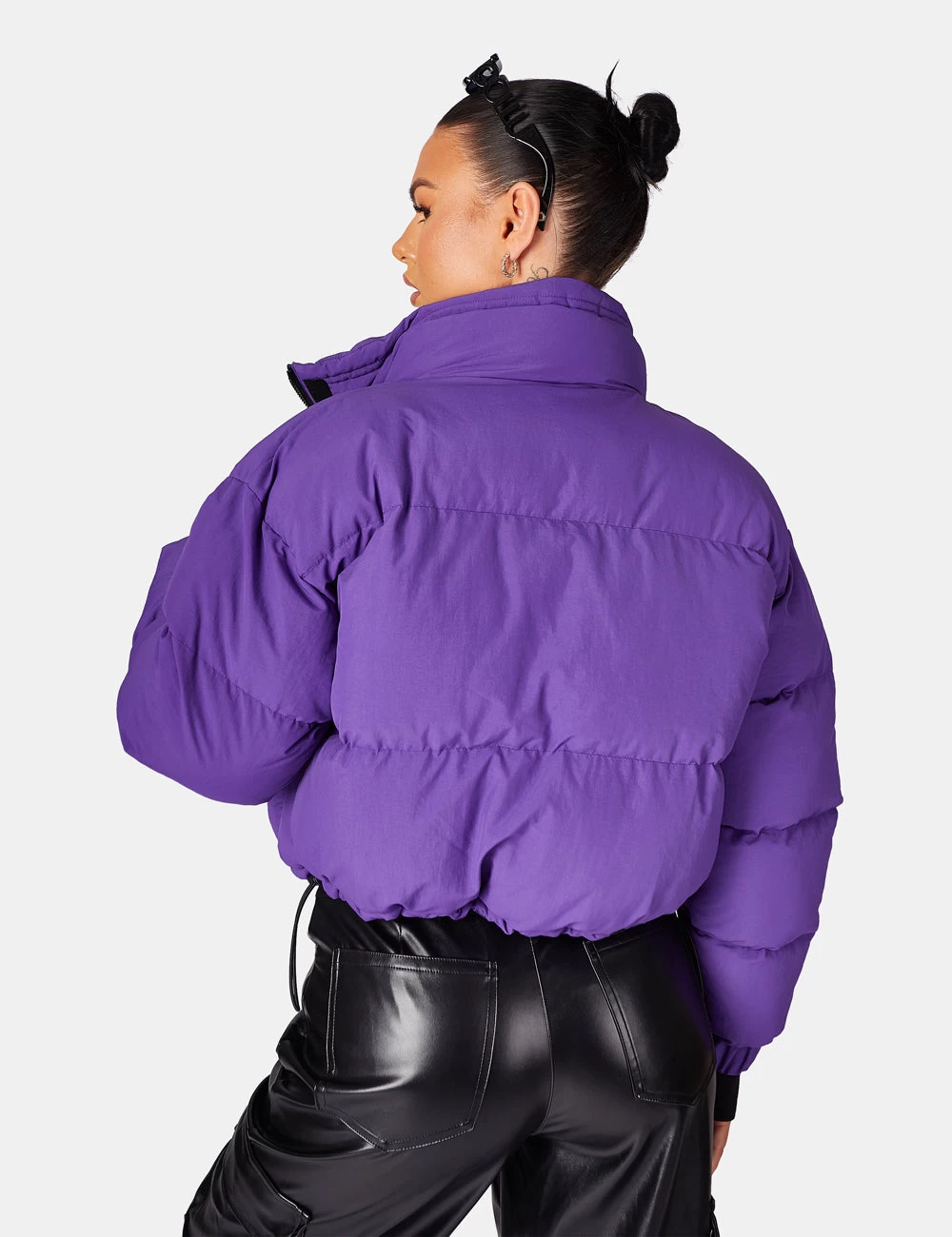 An cropped puffer made with a rich purple material . The model pictured is wearing a UK 8
