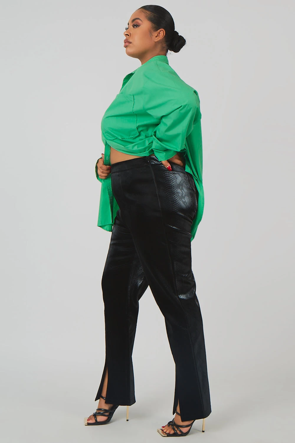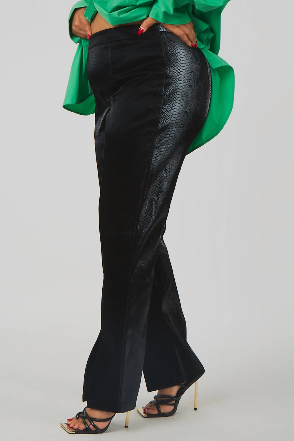 Perfect night out trousers featuring a front split hem in a black snakeskin pu material.