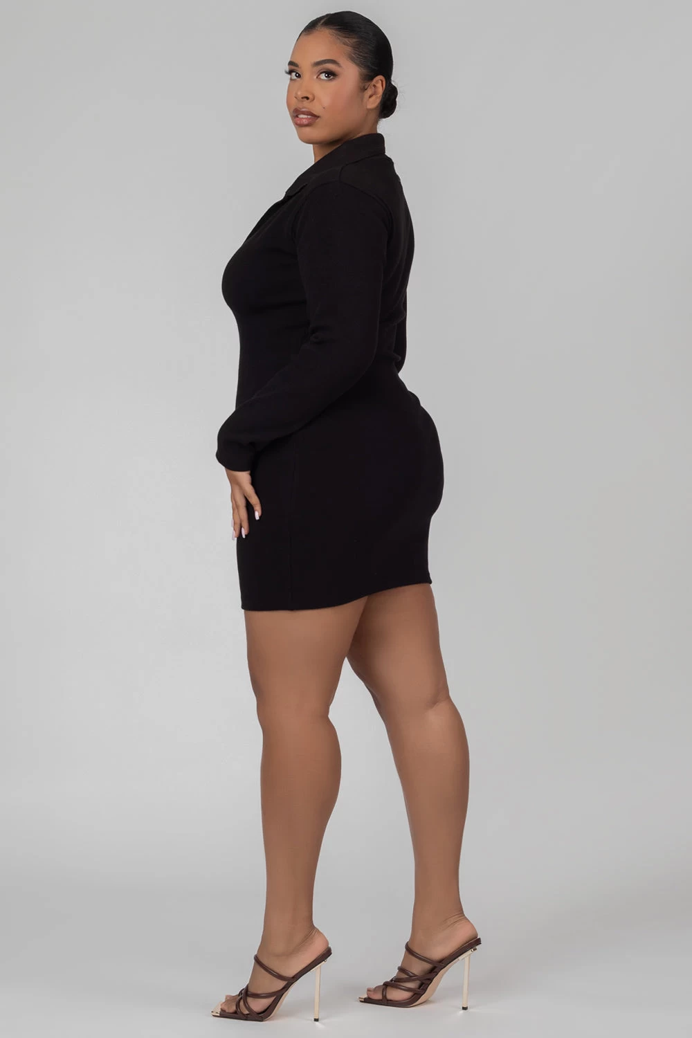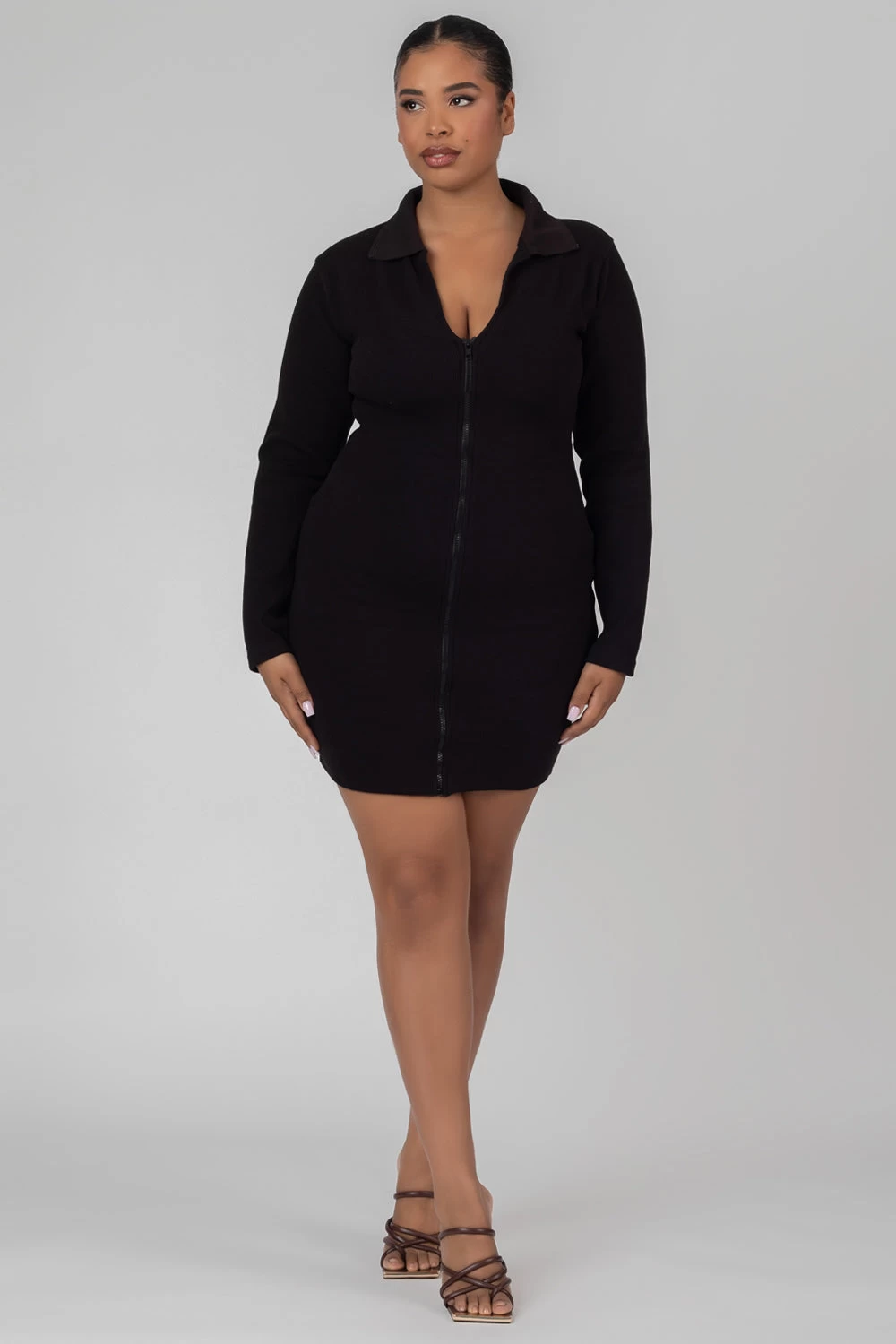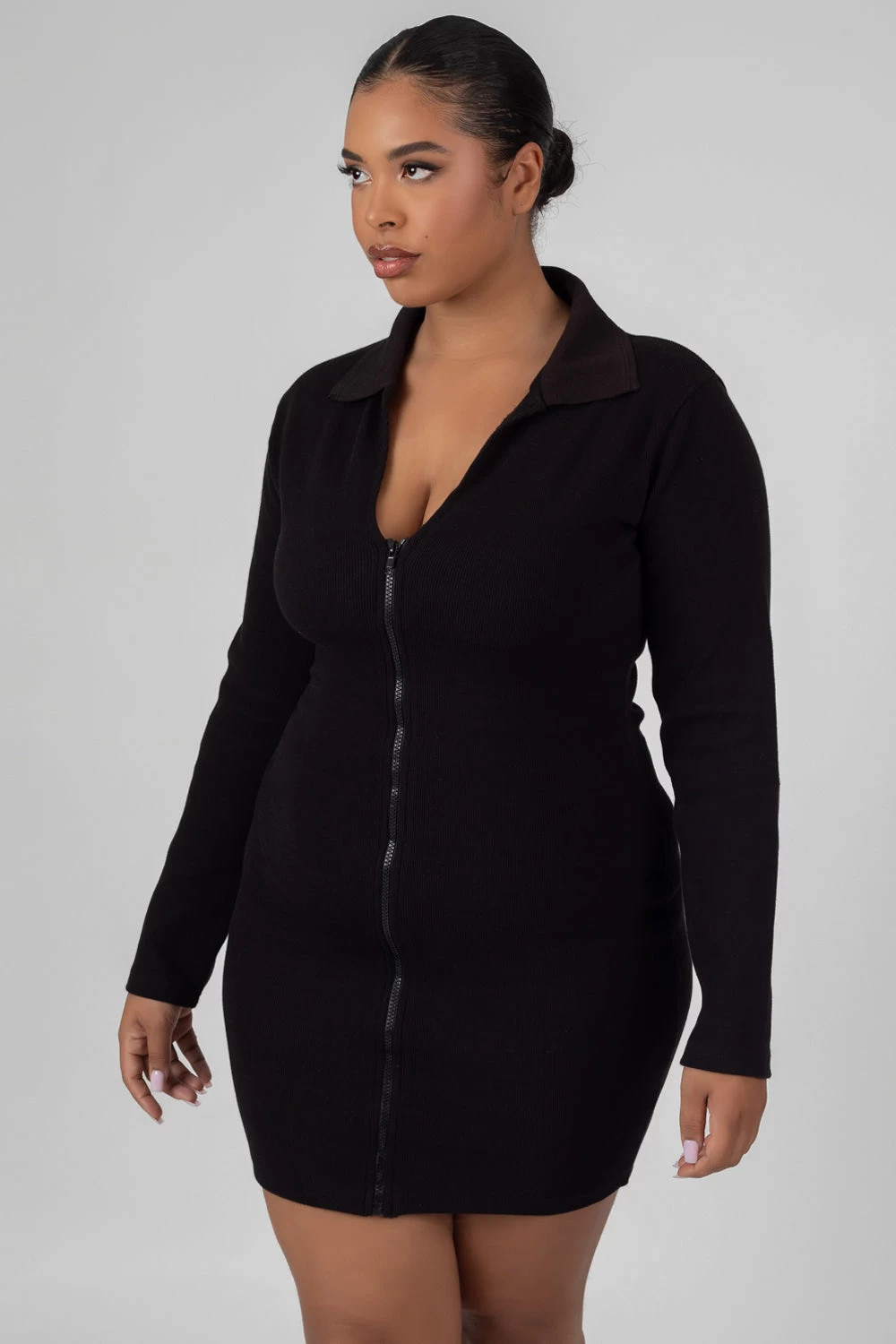 A mini dress in a ribbed material with long sleeves and a functional zip running down the centre of this little black dress. The perfect way to ugrade your LBD this season.