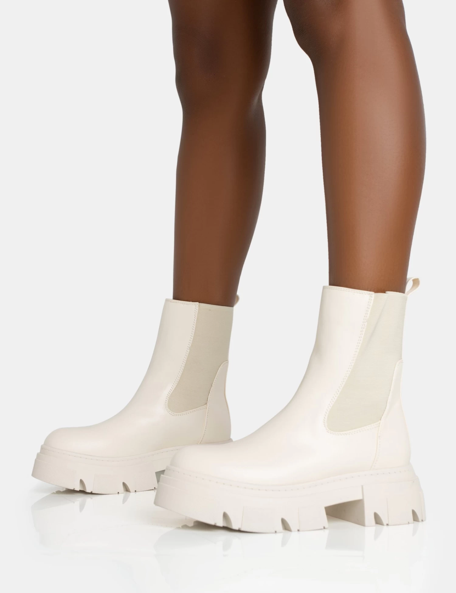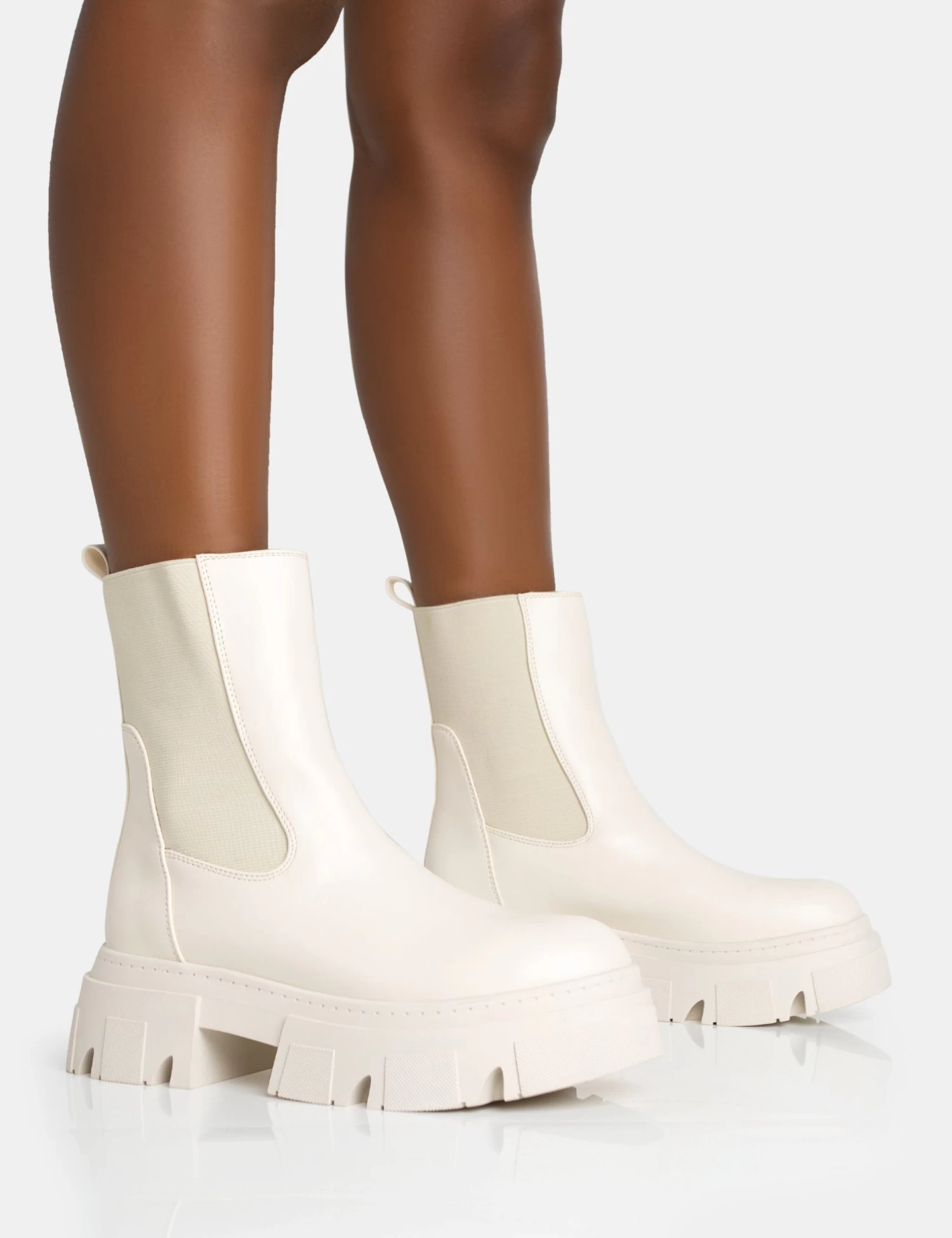 Step into fashion-forward world of these Edgy Cream Pu Elasticated Ankle Rounded Chunky Sole Ankle Boots . With a rounded chunky sole and an elasticated ankle to keep the warmth in, they’re sure to be your AW bestie. So why not give your style a spicy kick? Trust us, it’s a (stylishly) hot look!