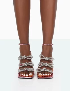 Amelia Pink Mirror Sparkly Diamante Strappy Bow Square Toe Stiletto High Heels