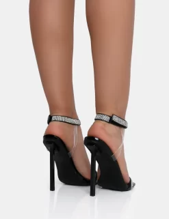 Afterglow Black Patent Barely There Diamante Strap Square Toe Stiletto Heels