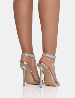 Afterglow Silver PU Barely There Diamante Strap Square Toe Stiletto Heels