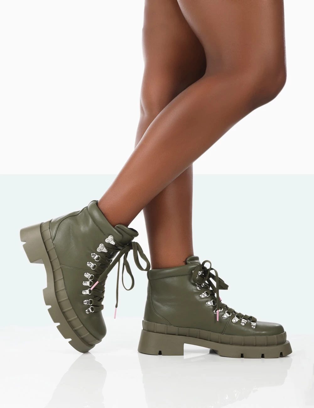 Hike There Khaki Pu Lace Up Chunky Sole Winter Boots