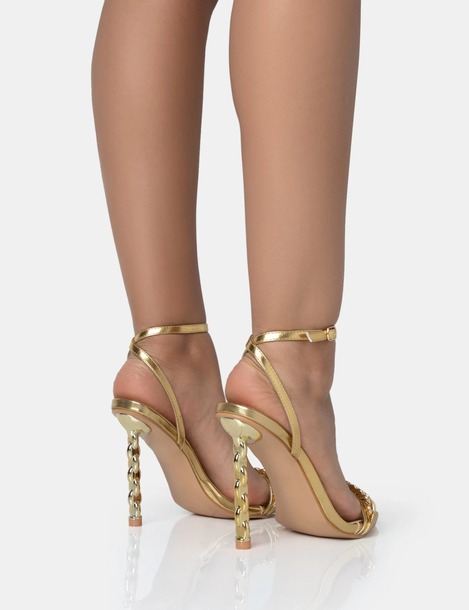 Link Up Gold Barely There Pointed Toe Stiletto Chain Heels