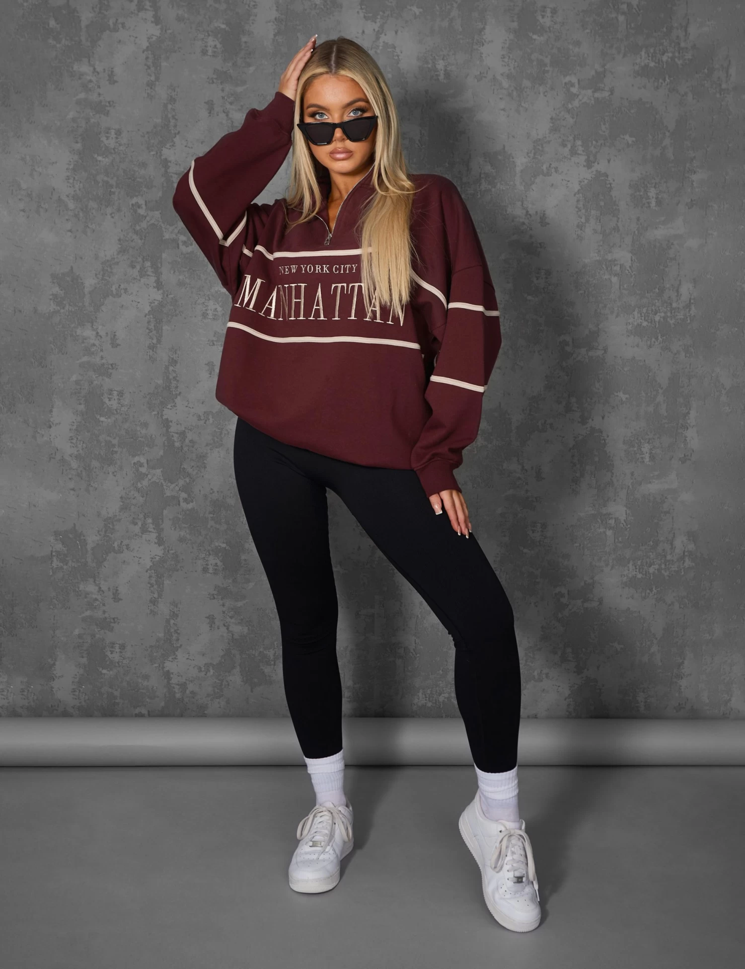 MANHATTAN SLOGAN HALF ZIP PULLOVER SWEATSHIRT BURGUNDY