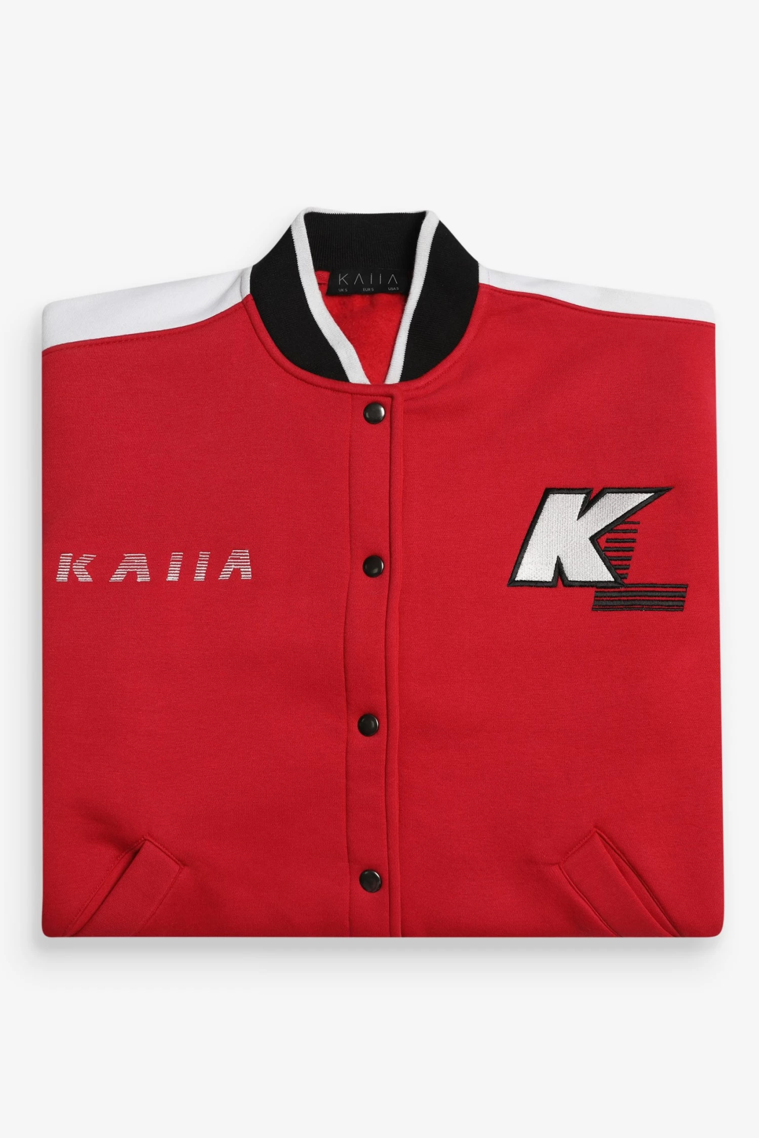 AN OVERSIZED FIT VARSITY MOTOCROSS STYLE JACKET BOMBER IN RED.