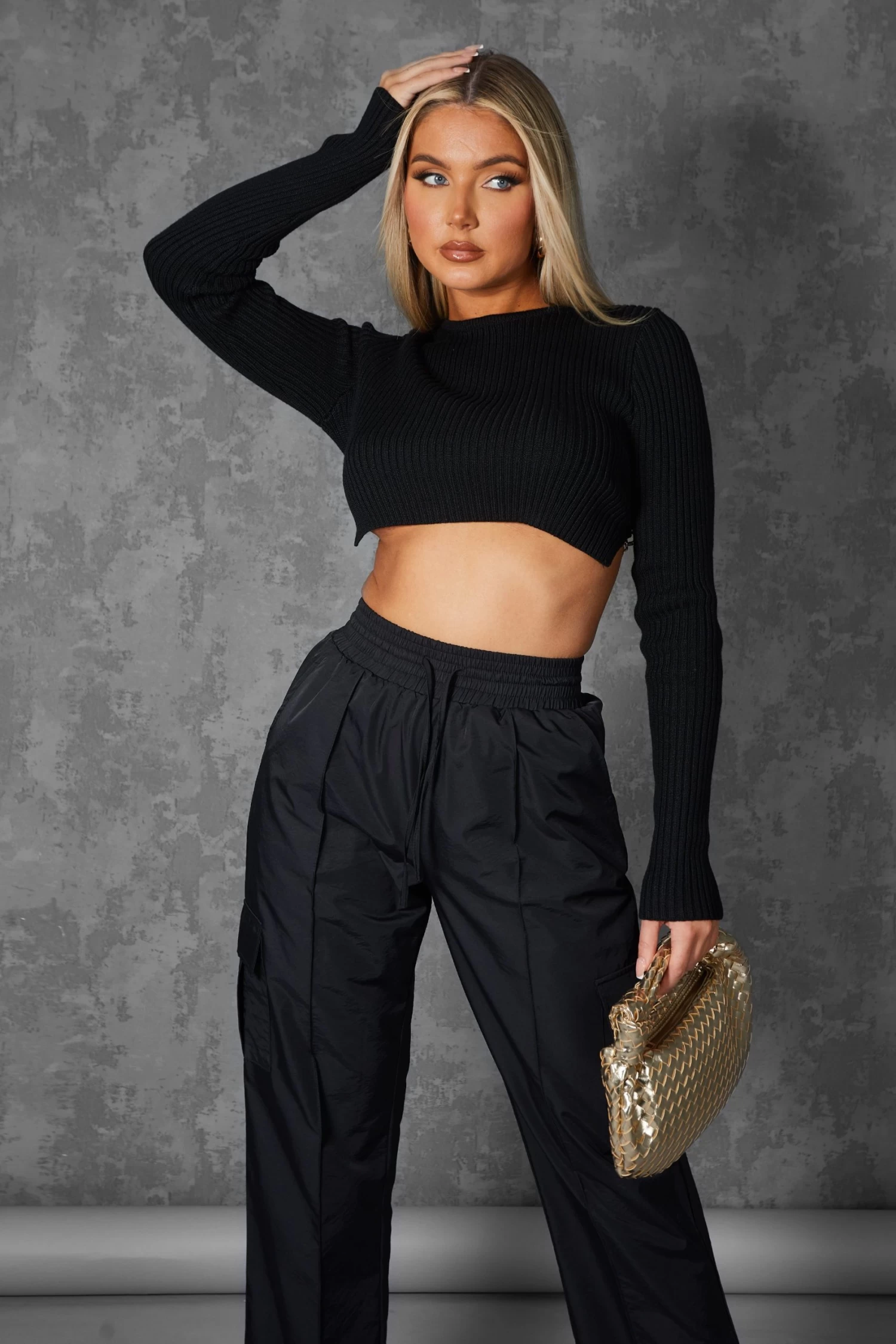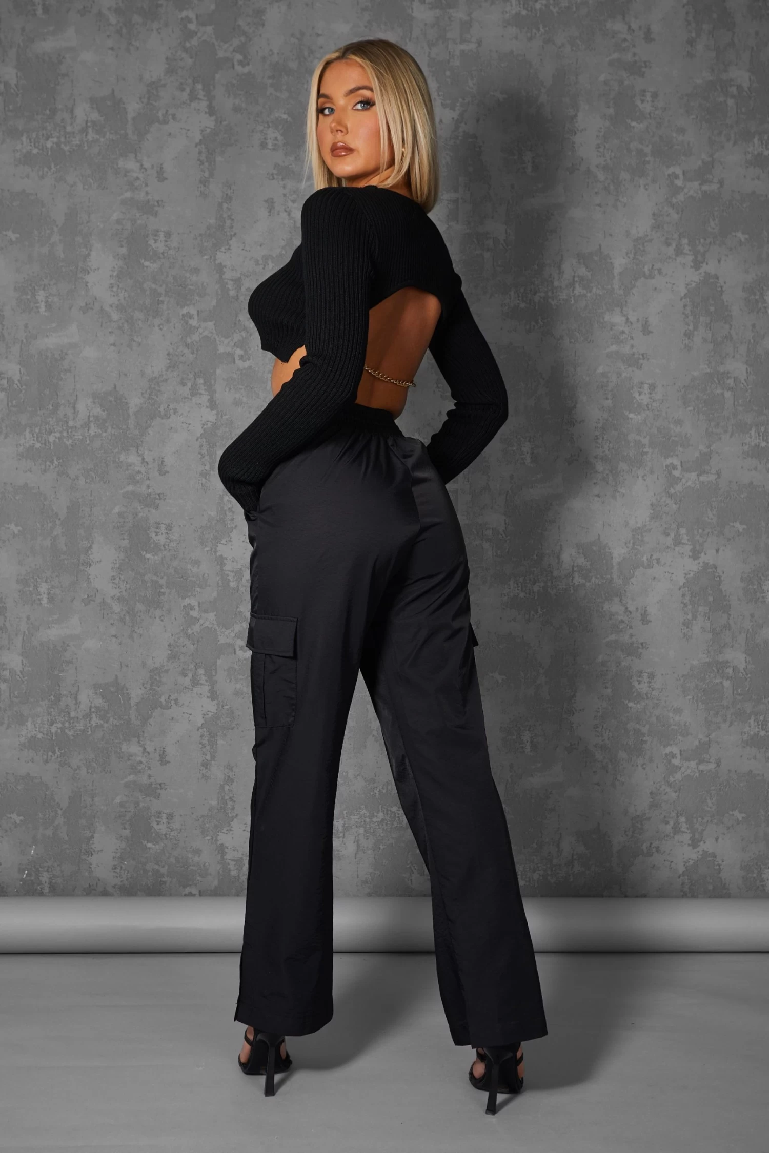 A knitted long sleeve crop top in black with an open back and chain detail