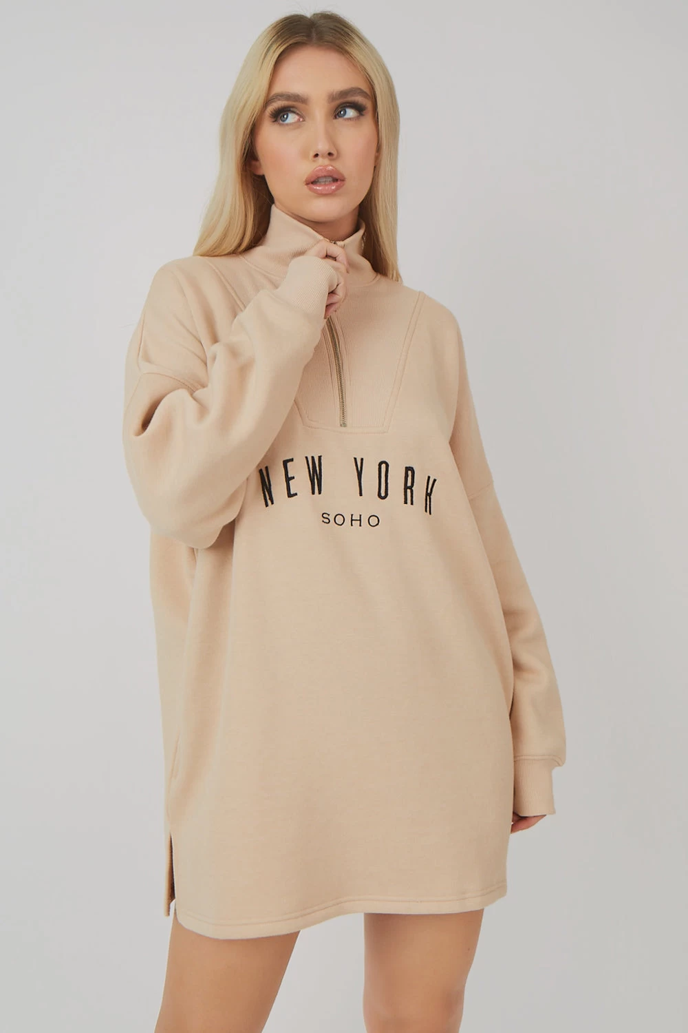 An oversized sweater dress with long sleeves, a functional half zip and ‘NEW YORK’ printed on