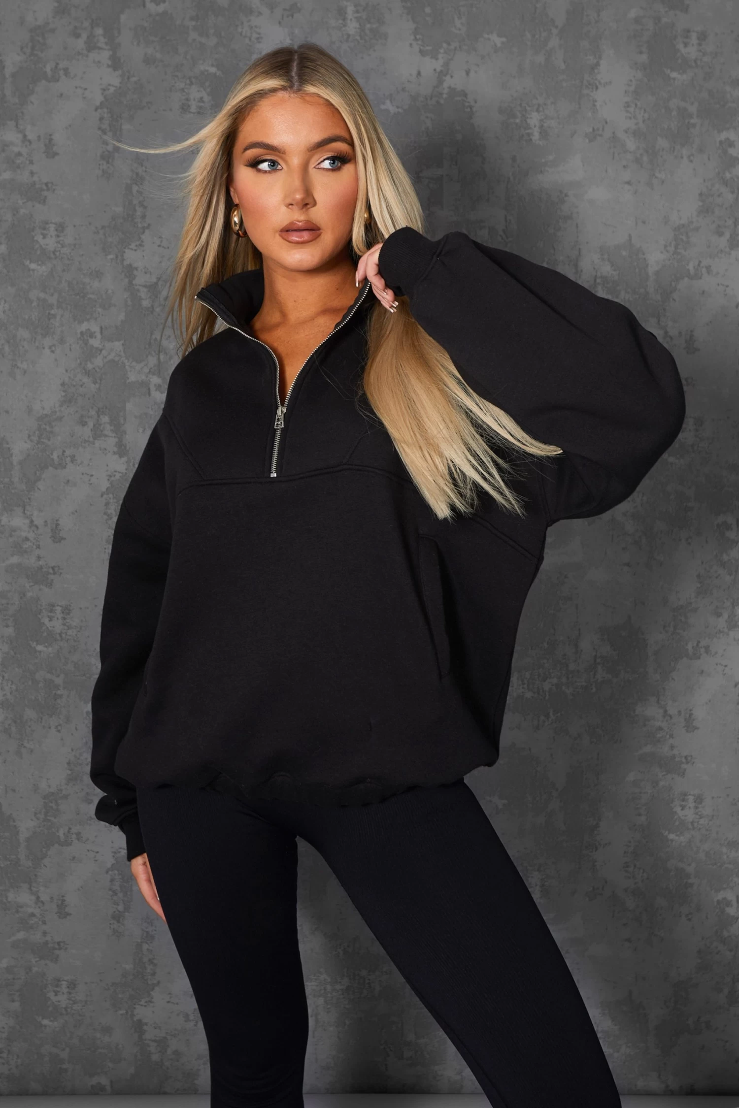 An oversized fit sweatshirt in black featuring a functional half zip and a front pocket