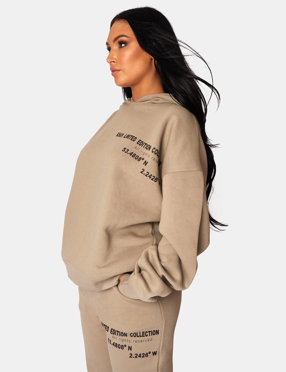 AN OVERSIZED FIT HOODIE IN LIGHT KHAKI WITH TEXT DETAILING