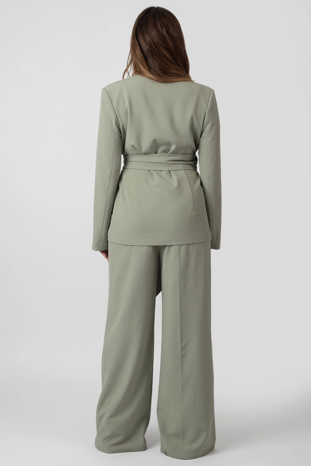 GIVE YOUR SUIT AN UPDATE WITH THESE HIGH WAISTED SAGE TROUSERS FEATURING A TIE WAIST AND FRONT POCKETS. WEAR WITH THE OBI BELT BLAZER FOR THE PERFECT FIT.Â