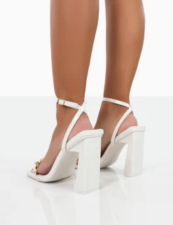 Sweetest White PU Strappy Heart Buckle Square Toe Stiletto Heels
