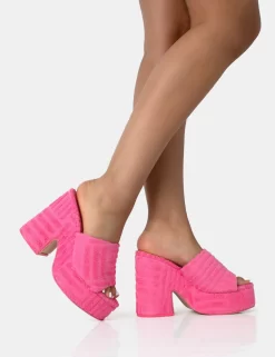 Wavez Pink Terry Towelling Round Toe Platform Block Heel Mules