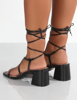Aloha Black Lace Up Block Mid Heeled Sandals