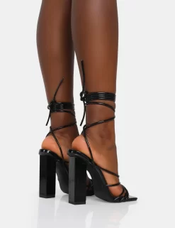 Nyla Black Patent Strappy Lace Up Square Toe Block Heels