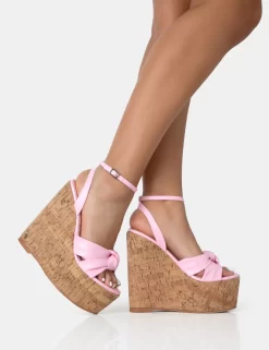 Sandy Pink PU Knot Strap Round Toe Cork Wedge Heels