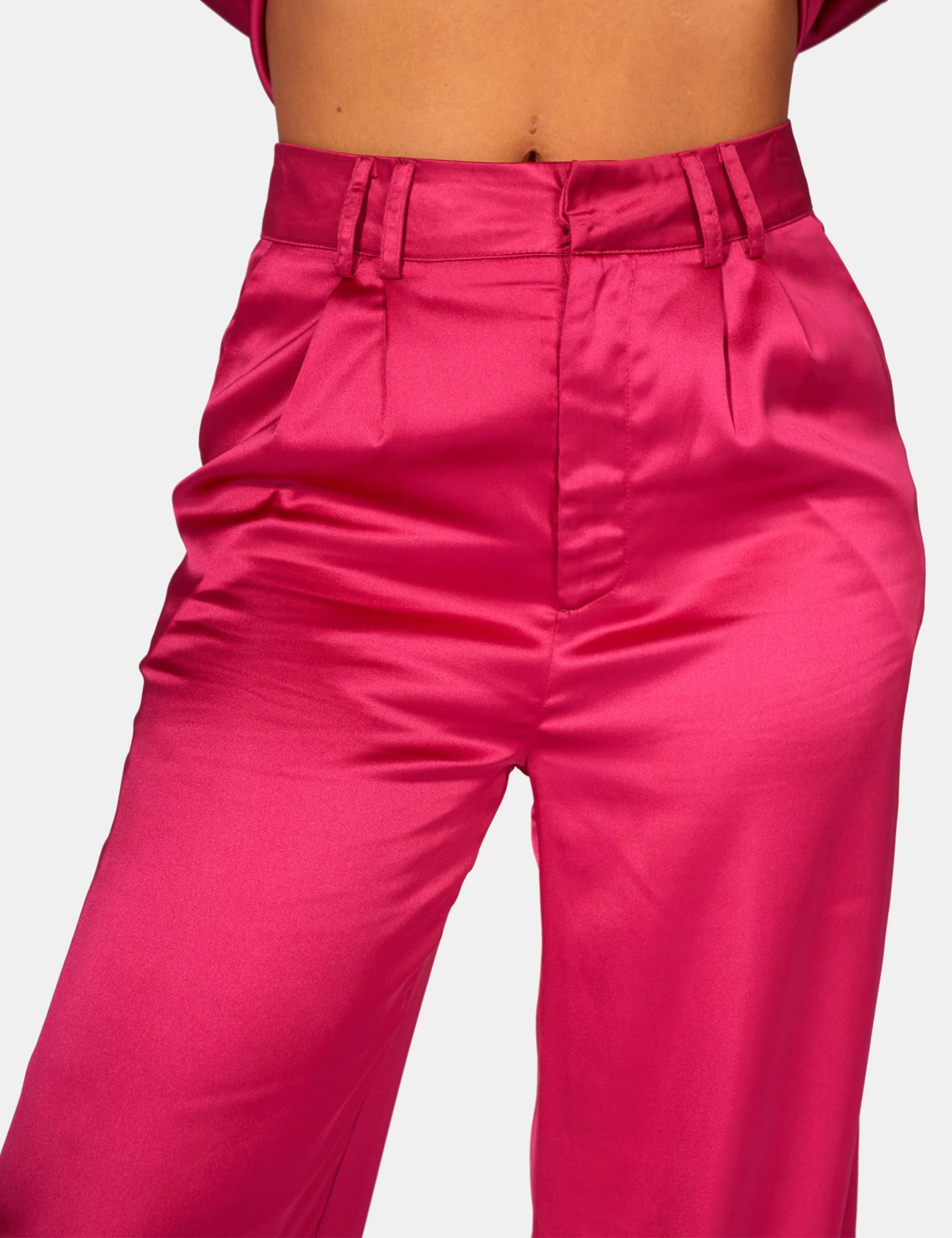 HIGH WAISTED TAILORED TROUSERS IN PINK SATIN FEATURING BELT LOOPS, A CONCEALED BUTTON AND FRONT POCKETS. PAIR WITH THE SATIN DAD BLAZER IN PINK FOR THE ULTIMATE SUIT.