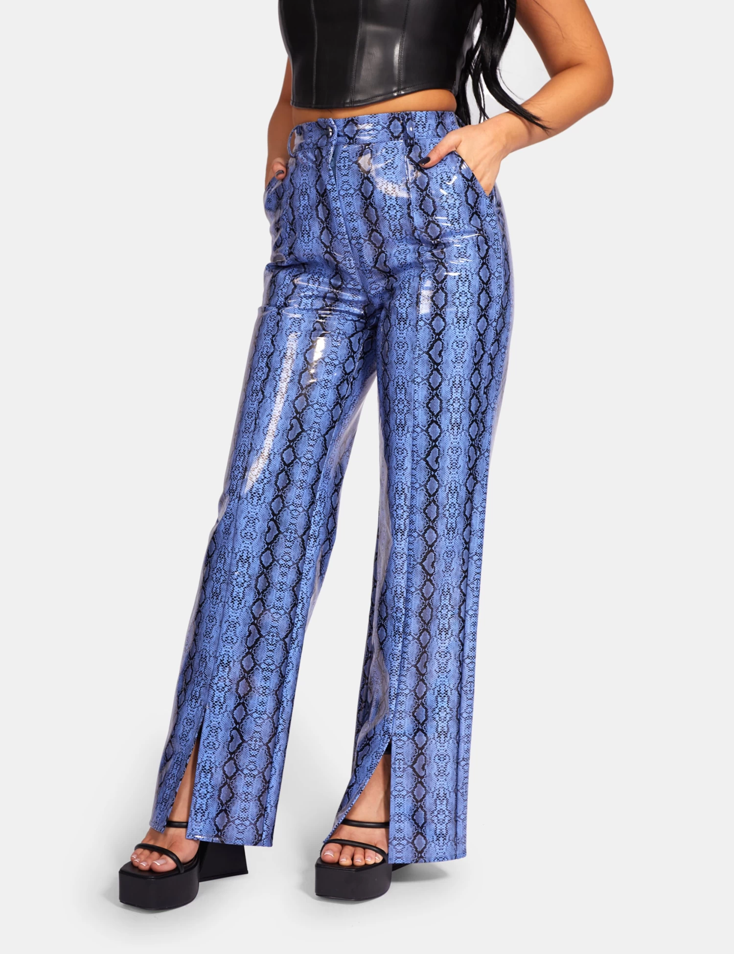 High waisted high shine PU fit spilt flare in blue snakeskin trousers.