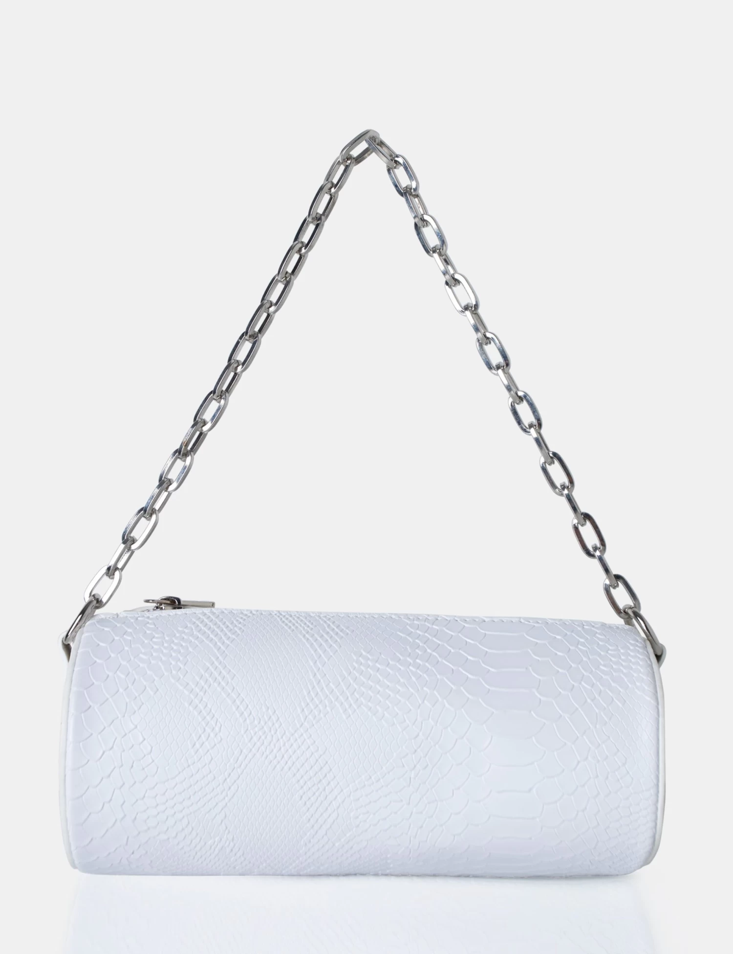 Be the talk of the town with The Claudia White Croc Shoulder Bag! This stylish number is sure to up your style game with a gleaming chain that adds just the right touch of chic. So don’t wait—show the world you’re ready to rock your look.
