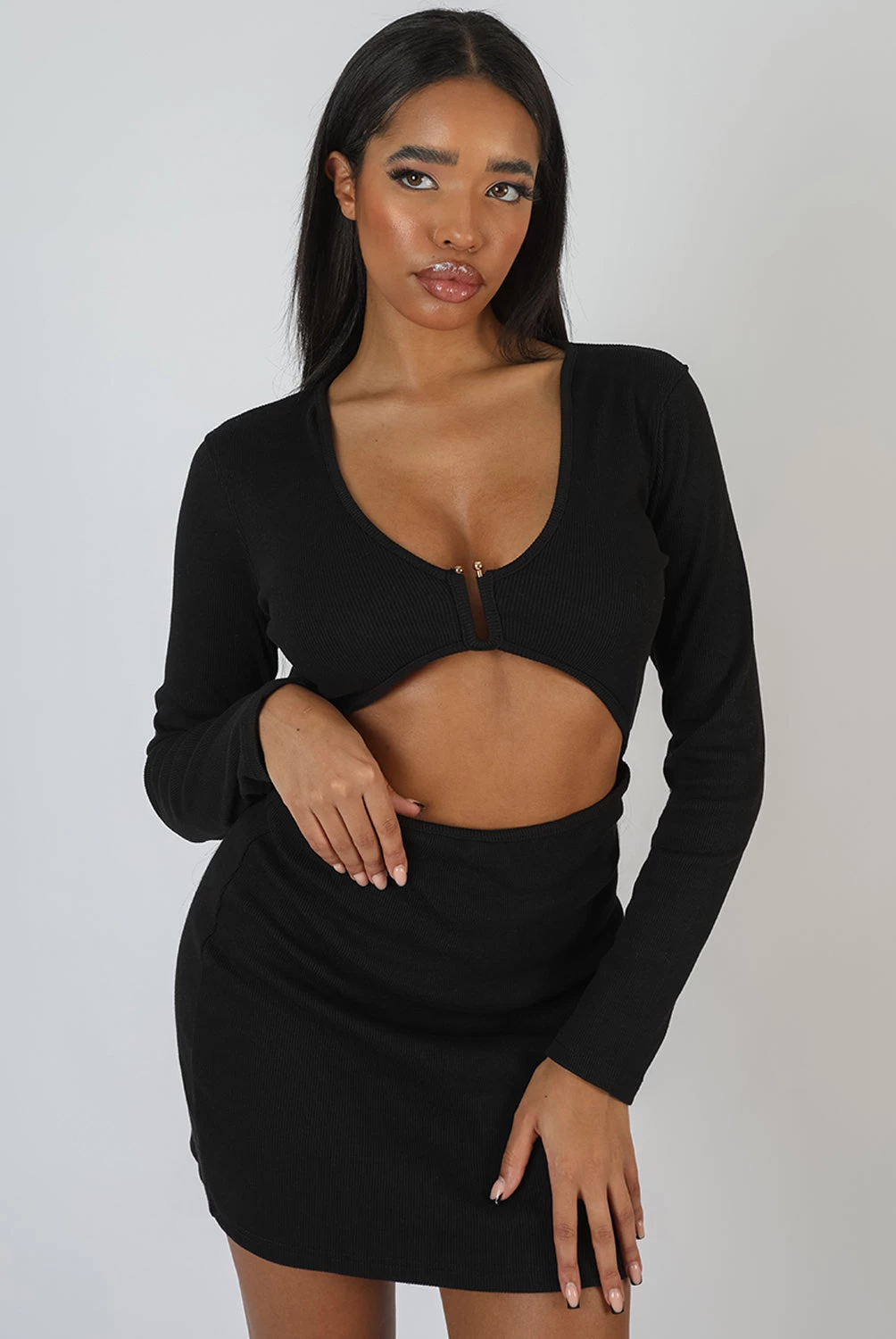 A MINI DRESS IN BLACK WITH A U-BAR TRIM DETAILING.