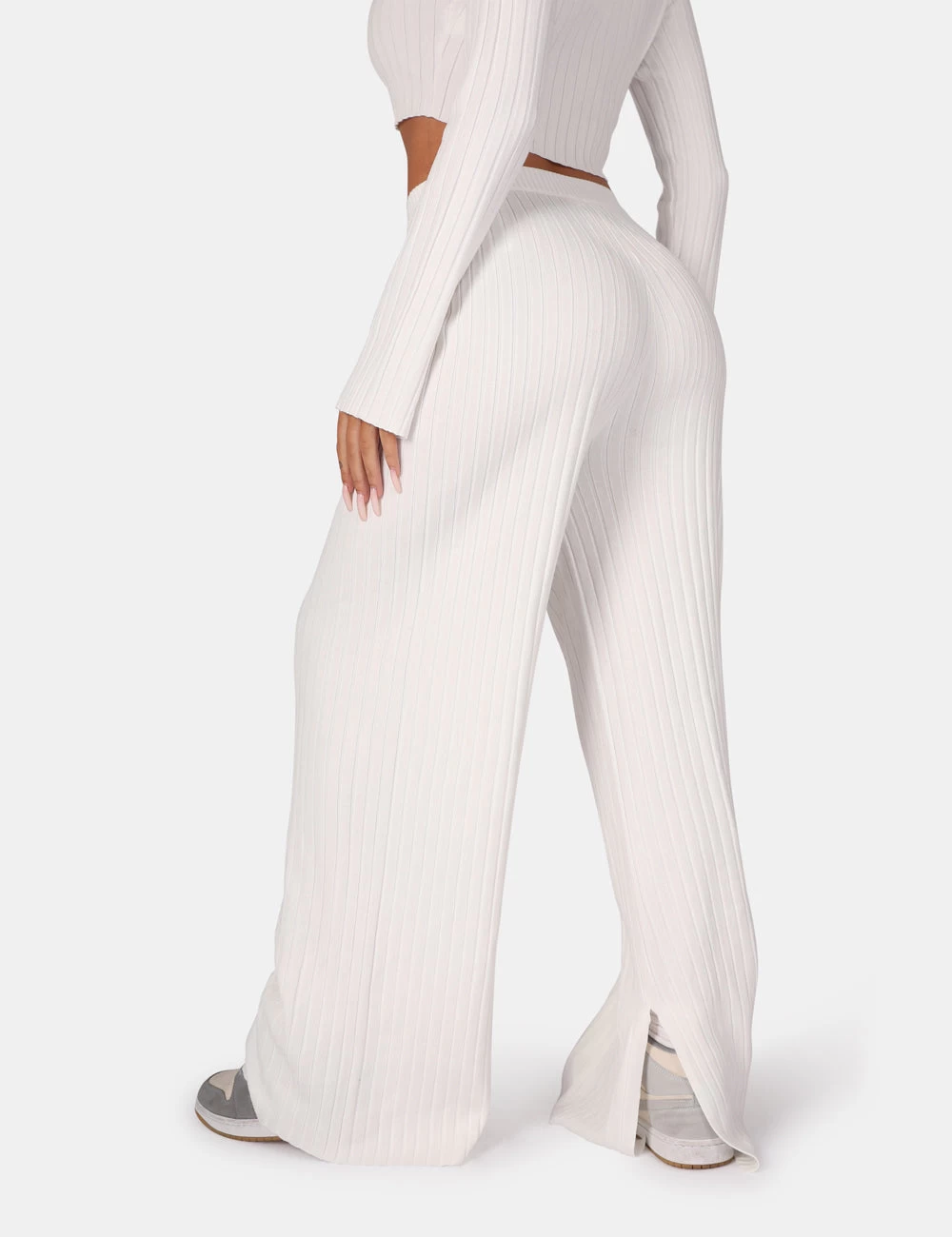 V front wide leg ribbed knitted trousers white