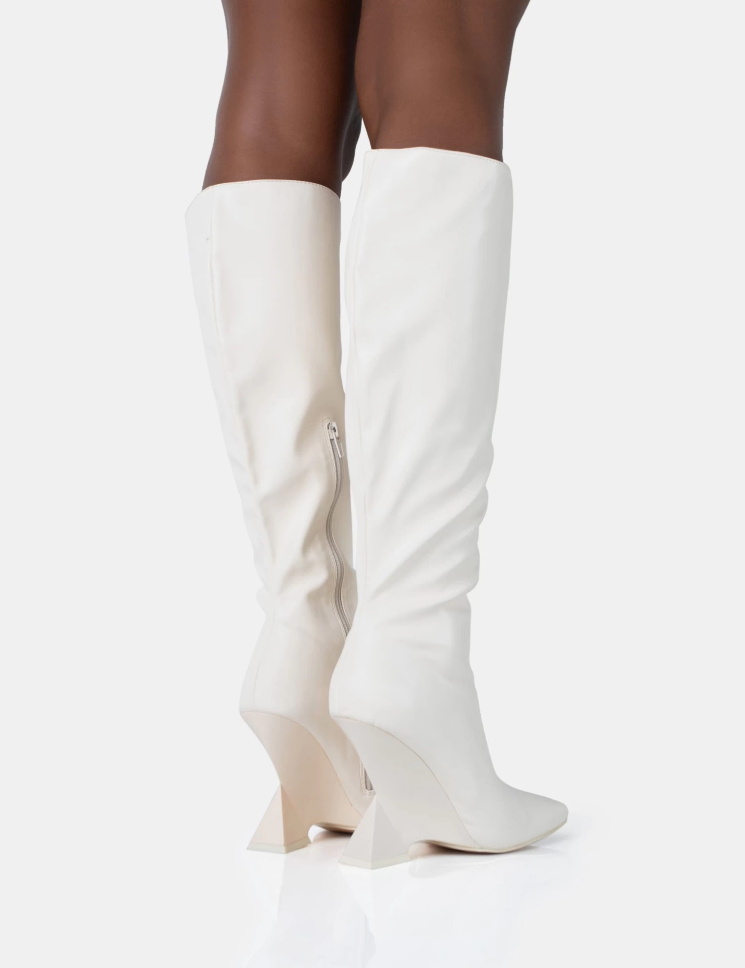 These Vanessa Ecru PU Inverted Wedge Square Toe Heeled Knee High Boots are the perfect classic style with a modern twist – you’ll be saying “yee-haw!” to your new AW bestie. Perfect for adding a hint of drama to any outfit!