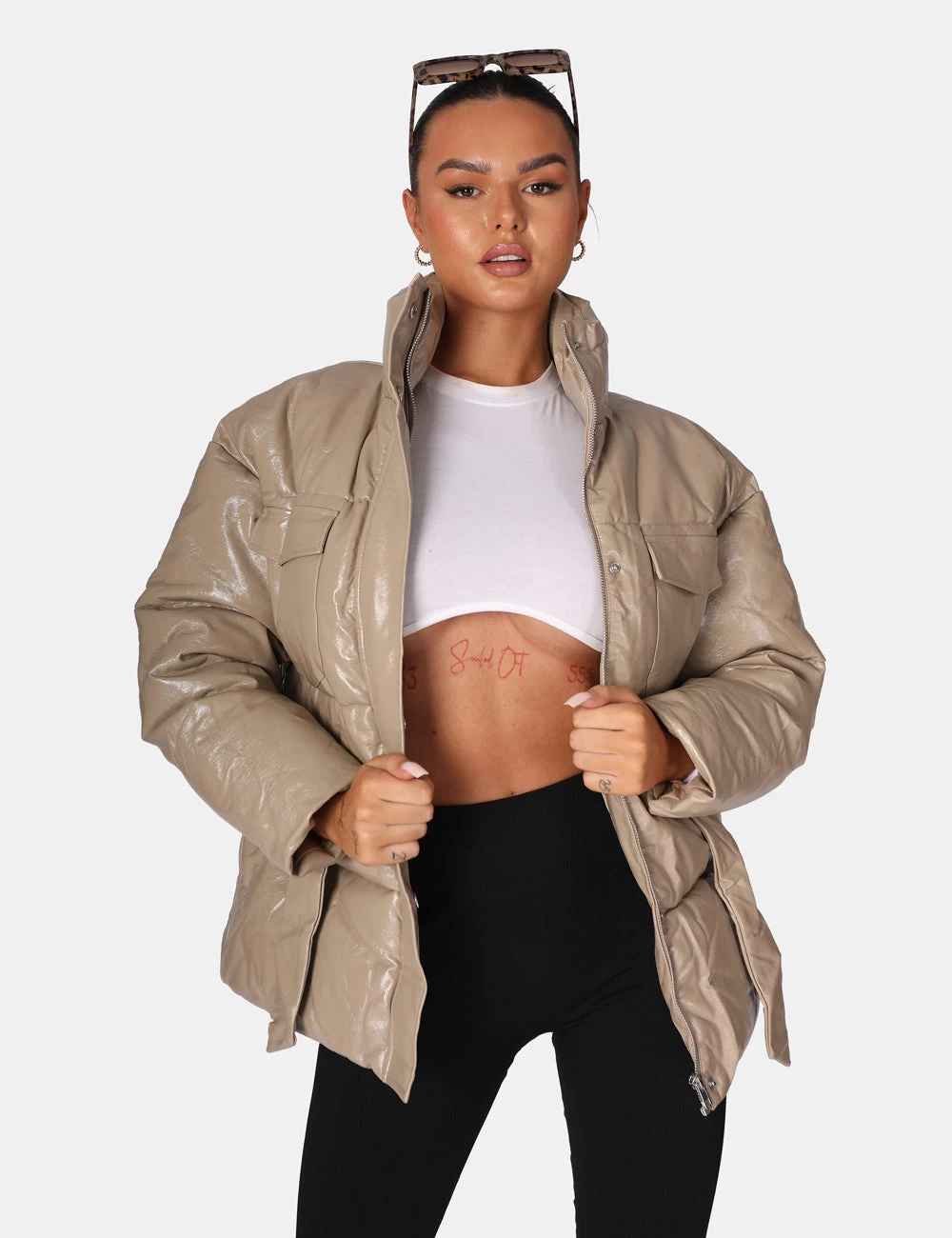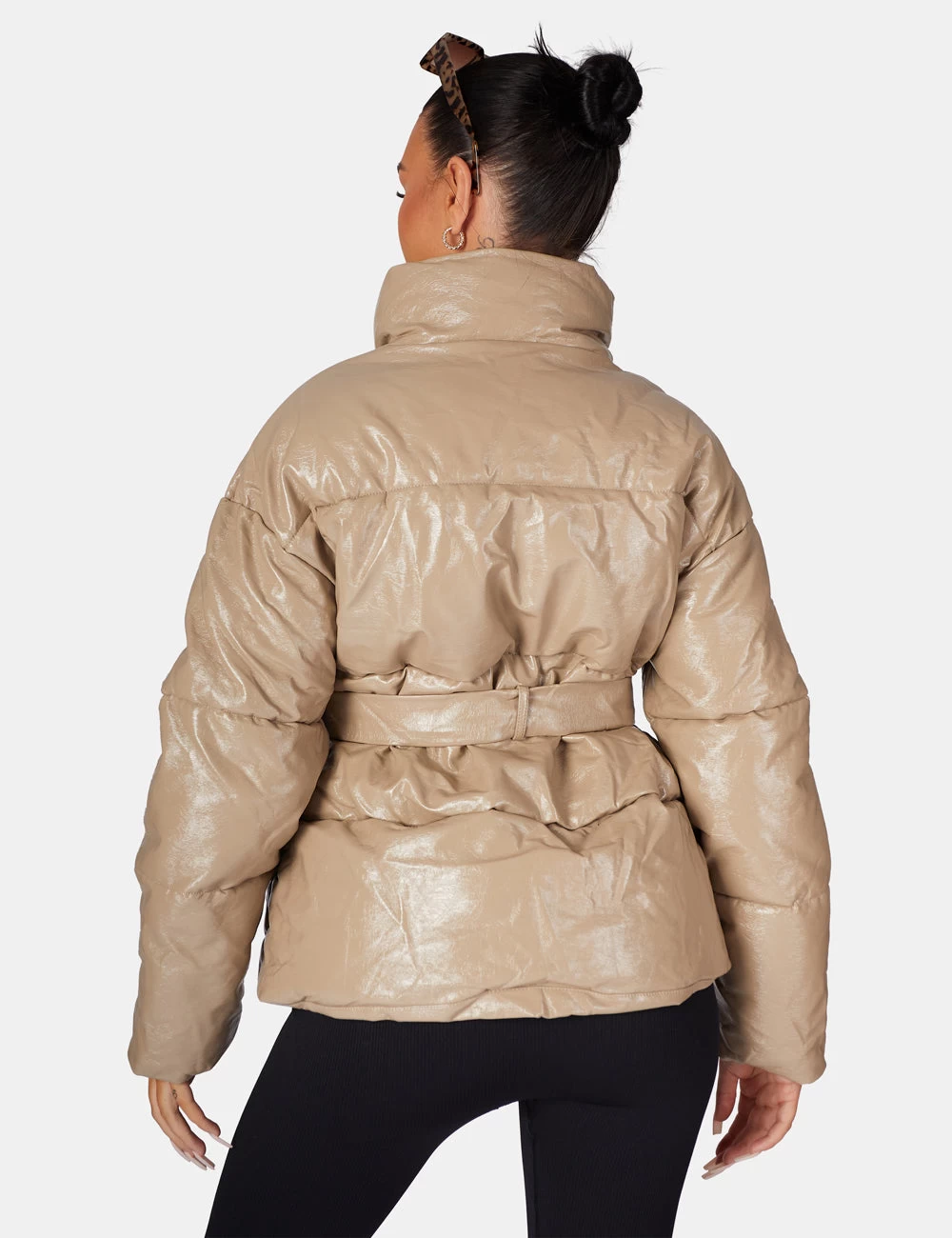 Update your Autumn wardrope with this vinyl puffer in stone featuring a belt tie and front pockets.